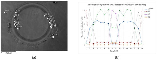 (a) Overview of the ball crater created on the articulating condyle of the oxidized femoral implant with the individual sublayers of the multilayer visible as well as marked with individual measurement points. (b) The chemical composition as atomic weight (%) measured at the individual points referring to the thin adhesive Cr bond layer, the five alternating intermediate layers of alternating CrN and CrCN layers, the transition layer and finally the ZrN layer, which marks the outer most layer with the oxidative discolouration.