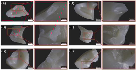 Observation of representative fracture surface structures of two multilayer monolithic zirconia crown samples (SZ and AZ) using an automatic focus-stacking function stereomicroscope. (A–C) show SZ samples, while (D–F) show AZ samples, corresponding to a maxillary right central incisor (A,D), maxillary right first premolar (B,E), and mandibular right first molar (C,F), respectively.