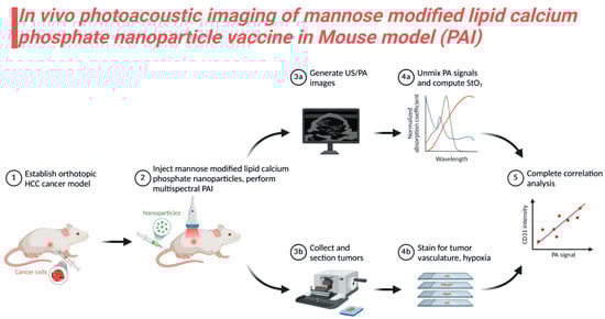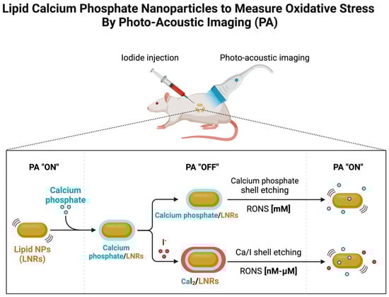 Our study used photoacoustic imaging (PA) to measure oxidative stress in lipid calcium phosphate nanoparticles. Lipid calcium phosphate nanoparticles were injected into the tumor site to locate the targeted organs and tumor sites in vivo, and the distribution and signal intensity of the lipid calcium phosphate nanoparticles were monitored in real time by using photoacoustic imaging technology; moreover, the intensity of the PA signal reflected the degree of oxidative stress []. During the observation process, we can infer the degree of oxidative stress in the tumor microenvironment from changes in signal intensity and further evaluate the role of lipid calcium phosphate nanoparticles in modulating the tumor immune response []. This process effectively combines lipid calcium phosphate, nanoparticle technology, and photoacoustic imaging technology to provide a feasible, noninvasive measurement method for the study of oxidative stress in the tumor microenvironment and provides an important reference for the optimal design of antitumor immunotherapy (Figure 4).