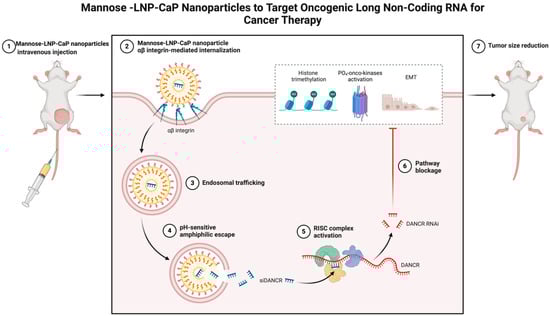 Schematic illustration of mannan-decorated lipid calcium–phosphorus nanoparticles (mannose-LNP-CaP) targeting carcinogenic long noncoding RNAs (lncrnas) for cancer therapy. This figure shows that mannan-decorated nanoparticles can specifically recognize and bind to cancer-causing lncrnas in tumor cells, inhibit their expression and function, and thus block the proliferation and metastasis of tumor cells.