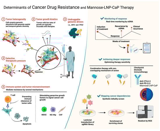 Drug resistance factors in cancer and treatment of mannose-modified lipid calcium and phosphorus nanoparticles (mannose-LNP-CAP). This figure shows that cancer drug resistance includes key factors such as the complexity of the tumor microenvironment, gene mutations, and drug efflux pumps. Mannose-LNP-CaP therapy overcomes drug resistance by targeting these resistance mechanisms, especially by precisely regulating the tumor microenvironment, enhancing antigen delivery, and activating immune cells, and significantly improves the efficacy of antitumor immune responses.