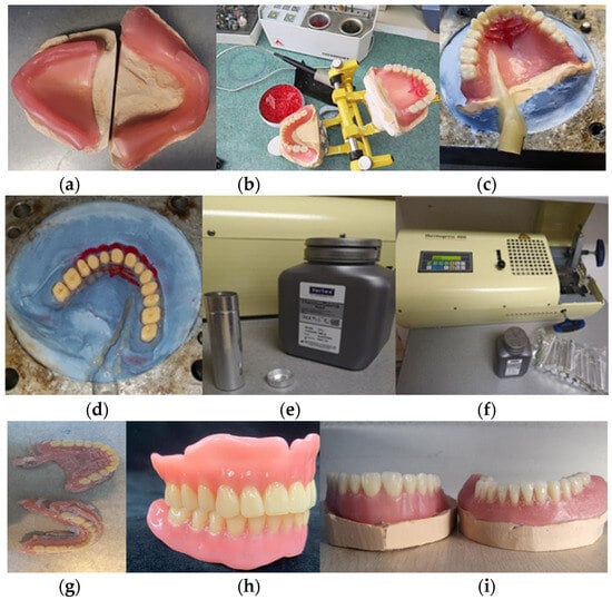 The figure illustrates the fabrication of PMMA traditional dentures: (a) Gypsum is poured into the preliminary impression; (b) Custom photopolymerizing resin impression trays are fabricated; (c) Wax rims have been applied to the final models; (d) Artificial teeth are sited; (e) The wax up is flasked; (f) Isolation prevents PMMA from sticking to the gypsum; (g) PMMA is packed in the void space left after the wax melted; (h) The denture base material filled flask is pressed to ensure proper adaptation of the material to the mold; (i) The flask is opened and the denture base is removed. The denture undergoes finishing and polishing processes.