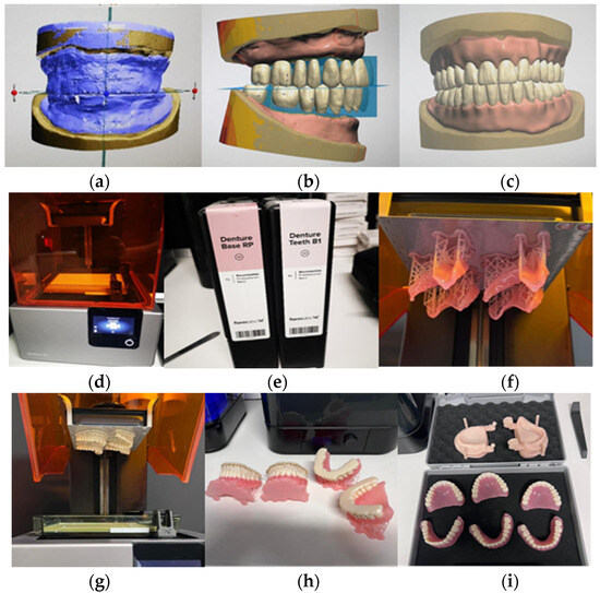 The figure illustrates the process of the fabrication of printed dentures: (a) Wax rims and model scan; (b) Teeth selection in CR (Centric Relation); (c) Final design of the denture base and teeth; (d,e) The printer and the resin cartridges with photopolymerizable resins; (f–i) The dentures during and right after printing.