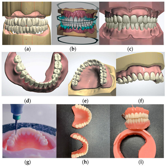 The figure illustrates the workflow for CAD/CAM dentures using Ivotion (Ivoclar): (a–c) Digital design of the dentures with teeth setting; (d–f) Individual arches can be inspected separately; (g) The monolithic disk is milled in PrograMill milling machine; (h,i) The milled dentures pending finishing.