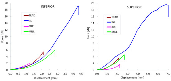 Mean Force-displacement curves for inferior and superior dentures, in compression (TRAD—traditional technology, INJ—injection technology, 3DP—3D printing, MILL—CAD/CAM milling technology).