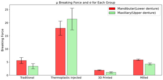 Regardless of the technology employed, upper dentures have generally fractured at lower force values compared to lower dentures, likely due to their architectural design.