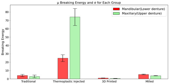 In the case of dentures fabricated using the traditional compression-molding technique, the force required for their fracture ranged between 2.25 kN and 7.89 kN in both architectures, with a mean value of 4.54 kN. The breaking energy exhibited values between 1.16 kJ and 6.79 kJ, with a mean of 3.58 kJ. For the thermoplastic injection technology, the values range between 14.14 kN and 28.17 kN, with a mean of 19.67 kN, for breaking force and between 17.71 kJ and 88.37 kJ, with a mean of 49.47 kJ, for breaking energy. The subtractive CAD/CAM denture, force results were seen in the range of 3.73 kN to 6.28 kN, with a mean of 5.09 kN, while the fracture energy ranges from 3.34 kJ to 6.03 kJ, with a mean of 4.63 kJ. The lowest values were observed in the case of 3D printed dentures. The fracture force required ranged between 0.72 kN and 2.23 kN, with an average of 1.51 kN, and the recorded fracture energy was between 0.28 kJ and 1.35 kJ, with a mean value of 0.81 kJ.