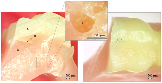 Stereo fractography of injected denture. A—denture base, B—Interface between denture base and artificial tooth, C—artificial tooth.