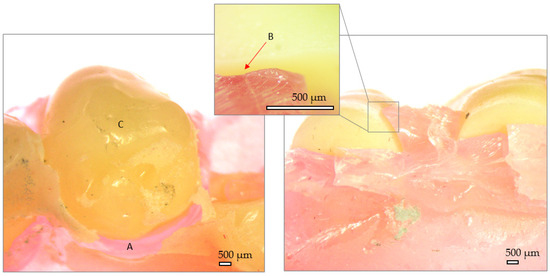 Stereo fractography of milled denture. A—denture base, B—Interface between denture base and artificial tooth, C—artificial tooth.
