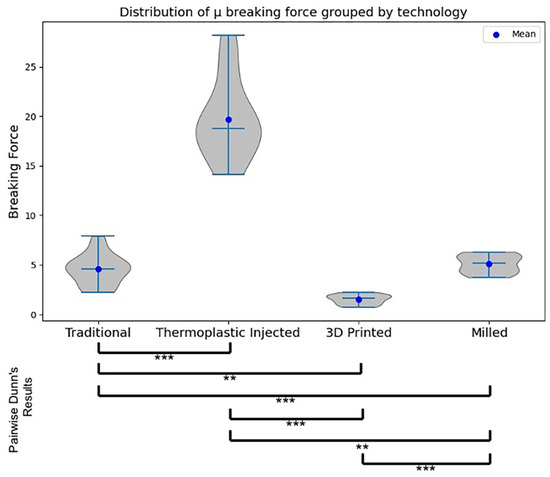 Levene’s test implies significant differences in terms of variance across groups: p = 0.0001 for the force and p = 0.0000 for the energy. As such, the ‘kruskal’, ’levene’, and ‘posthoc_dunn’ methods of ‘scipy.stats’ and ‘scikit_posthocs’ Python libraries were employed for non-parametric statistical methods, as the assumption of homogeneity of variance is not met. A Kruskal–Wallis test (α = 0.001) was conducted twice to assess if there are significant differences pertaining to both the mean breaking force and energy across the four groups representing the processing technologies. Then, upon finding significant differences across the four groups, post-hoc pairwise comparisons were performed twice (for both force and energy) using Dunn’s test (α = 0.001) with a Bonferroni correction to control for multiple comparisons. Quantitative variables were expressed as Mean ± Standard Deviation and as Median (Quartile1–Quartile3).