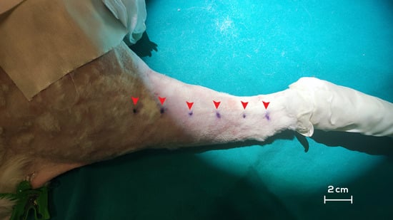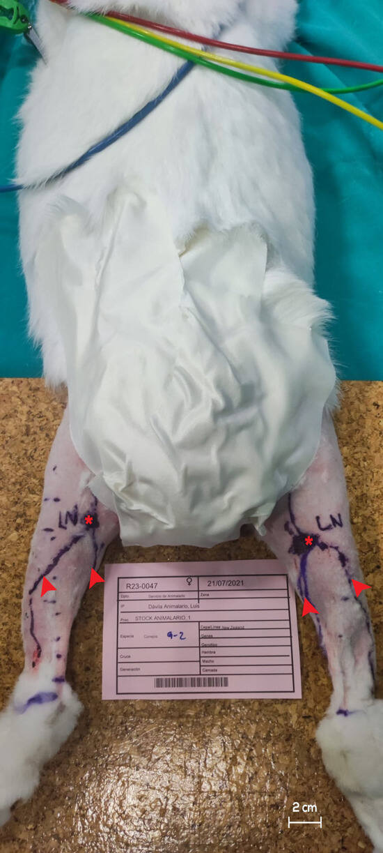 - Campos, J.L.; Pons, G.; Rodriguez, E.; Al-Sakkaf, A.M.; Vela, F.J.; Pires, L.; Jara, M.J.; Sánchez-Margallo, F.M.; Abellán, E.; Masiá, J. Popliteal vascular lymph node resection in the rabbit hindlimb for secondary lymphedema induction. J. Vis. Exp. 2022, 189, e64576. [Google Scholar] [CrossRef]
