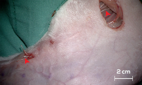 Measurement of the hindlimb volume of the rabbit at 2 cm intervals. The points delineated with a surgical marker correspond to points 0, 2, 4, 6, 8, and 10 (red arrowheads).