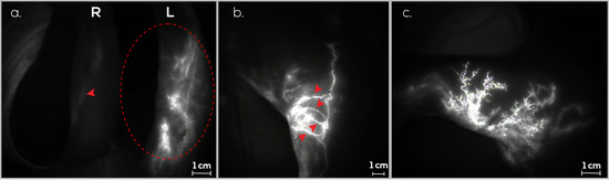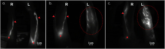 Monitoring lymphatic patency and assessing secondary lymphedema in the right (R) and left (L) hindlimbs of rabbits using ICG lymphography in the control group (G3). (a). Assessment of both hindlimbs on day 0 before secondary lymphedema induction. Afferent lymphatic vessels (red arrow) and PLN (red asterisk) are visible. No dermal backflow is detected. (b). Evaluation of both hindlimbs on day 30 after secondary lymphedema induction. Afferent lymphatic vessels (red arrow), PLN (red asterisk), and a dermal reflux image in the left hindlimb (red dashed circle) are evident. (c). Examination of both hindlimbs on day 60 after secondary lymphedema induction. Afferent lymphatic vessels (red arrow), PLN (red asterisk), and an image compatible with dermal reflux in the left hindlimb (red dashed circle) are observed.
