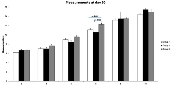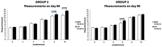 Throughout the follow-up assessments, no anomalies in vital physiological parameters were observed. The mean weight of the rabbits was 4.8 kg (range, 3.7–6.2 kg). The mean diameter of the PLNs measured was 1.17 cm (range, 0.8–1.8 cm). Circumferential measurements of the right and left hindlimbs are shown in Figure 7. No significant differences were observed in any group when the treated hindlimb was compared to the control. However, the comparison of the diameters obtained in the operated hindlimbs among the three groups (assessed via the Kruskal–Wallis test) revealed significant differences only at location 6 after 60 days (p = 0.029). Post hoc tests indicated that these differences stemmed from significant variations between G1 and G3 and between G2 and G3 (Figure 8). After the completion of the follow-up period, the rabbits were euthanized according to the described protocol, and samples were collected for further analysis.
