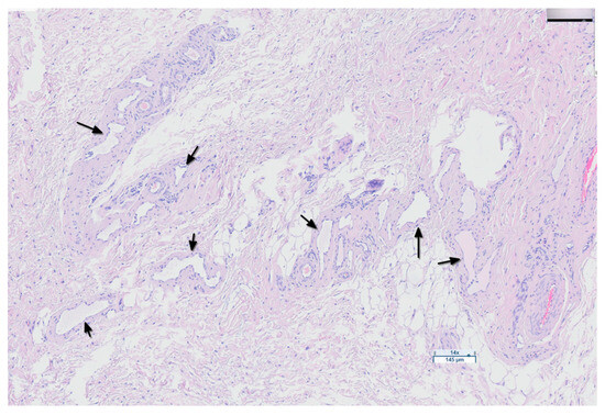 Digital microscopic image (Aperio GT 450 DX system) showing lymphangiogenesis in a specimen from a G1 study subject (black arrows).
