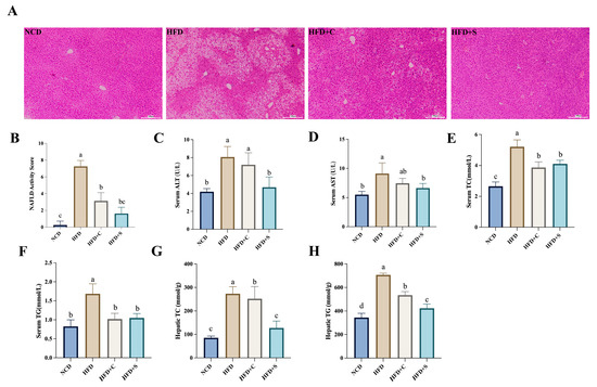 Variations in liver and blood lipid parameters among mice in different treatment groups. (A) Sections of liver tissue were stained with H&E (proportional scale: 100 μm); (B) NAFLD activity score; (C) serum ALT; (D) serum AST; (E) serum TC; (F) serum TG; (G) Hepatic TC; (H) Hepatic TG. Data are presented as the mean ± SEM (n = 6). The distinct letters above the bar chart indicated significant differences (p < 0.05). H&E, Hematoxylin and Eosin; NAFLD, nonalcoholic fatty liver disease; ALT, alanine aminotransferase; AST, aspartate aminotransferase; TC, total cholesterol; TG, triglyceride; HFD, high-fat diet; SEM, standard error of the mean.