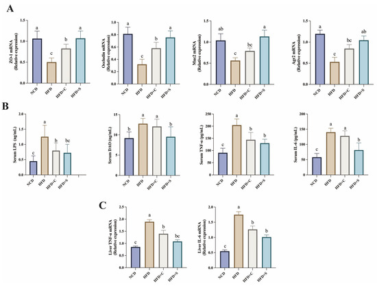 Long-term HFD induces sustained low-grade inflammation and leads to the development of NAFLD [25]. In our study, results of colonic tissue staining with H&E and AB-PAS revealed that LCS-SeNPs improved colonic mucosal epithelial damage induced by HFD, significantly restored the number of goblet cells, and increased intestinal mucus thickness (Figure 3A–E). Moreover, TEM also revealed a significant increase in mucin granules within goblet cells of the colon (shown by the arrow) in mice treated with LCS-SeNPs (Figure 3F), corroborating the findings of AB-PAS staining. To delve deeper into the mechanisms underlying LCS-SeNPs-mediated improvement in intestinal barrier permeability, the relative mRNA expression levels of zonula occludens-1 (ZO-1), occludin, mucin 2 (Muc2), and anterior gradient 2 (Agr2) in the mouse colon were evaluated by real-time PCR (Figure 4A). The findings revealed that LCS-SeNPs significantly elevated the relative mRNA expression levels of ZO-1, occludin, Muc2, and Agr2 in the colon compared with the HFD group. Disruption of the intestinal barrier allows inflammatory factors to invade the bloodstream [26,27,28]. Hence, we monitored the levels of relevant inflammatory factors in the serum of each group. The results indicated that the levels of LPS, DAO, TNF-α, and IL-6 were significantly higher in the HFD group compared with the NCD group (Figure 4B). In contrast, LCS-SeNPs significantly reduced these levels. Moreover, we found that the relative mRNA expression levels of TNF-α and IL-6 in the liver were significantly increased in the HFD group, while the LCS-SeNPs significantly decreased these two inflammatory cytokines. These findings indicated that the LCS-SeNP intervention mitigated the intestinal barrier dysfunction induced by an HFD in mice.