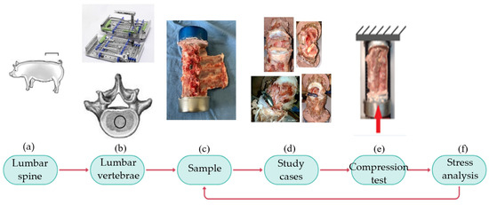 Figure 1 summarizes the methodology. First (Figure 1a), vertebrae L2–L5 are removed from the porcine lumbar region. Figure 1b shows the medical instrumentation (pedicle probe, pedicle awl, pedicle screwdriver, rod bender, rongeurs, drill guides, and surgical retractors) to drill a hole in the soft tissue. The drill hole should be 2 mm smaller than the implant dimensions to ensure proper tightening. Afterward, a sample is fixed into cans with a dental cast (Figure 1c). The experimental design evaluated the biomechanical behavior of four SIs (Figure 1d). Twelve compression (Figure 1e) tests are performed to determine which implant reduces SS. Finally, the results analysis indicates if the experiments were carried out correctly or if the technique used to obtain the specimens should be corrected (Figure 1f).