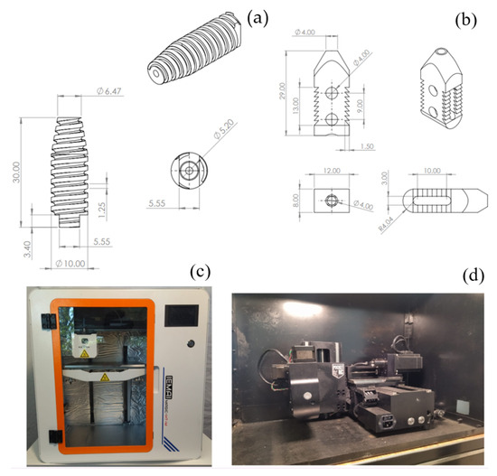 PEEK implants were printed with a MAGIC-HT-M machine (Dongguan Imai Intelligent Technology Co., Ltd., 2nd Floor, Building F, N0.6 Hupan road, Dalingshan Town, Dongguan, Guangdong, China) (Figure 2c). This product is specifically engineered for use with engineering plastics. It can withstand temperatures of up to 450 °C, with an extruder temperature of 150 °C, a hotbed temperature of 90 °C, and a chamber temperature of 90 °C. PEEK was printed at a speed of 15 mm/min. For the impression, the threads’ direction is parallel to the prosthesis longitudinal axis. Titanium prostheses were manufactured in Pocket NC V2-10 (Penta Machine Company, 119A Gold Miner Ln, Belgrade, MT 59714, USA) (Figure 2d). It can cut materials up to a hardness of G5 titanium, although it optimally cuts Delrin, aluminum, or softer steels. Travel is 128.3 mm (Y), 115.5mm (X), and 90.1mm (Z). Titanium is machined at 300 rpm and a feed rate of 6 mm per revolution.