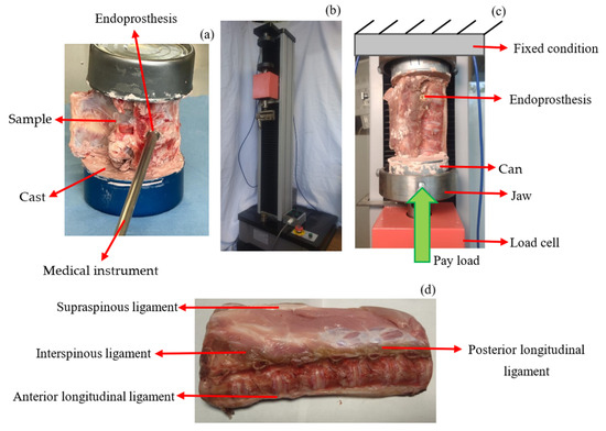 Bones were obtained from twelve porcine corpses that were frozen at a temperature of minus 20 degrees Celsius, and muscle tissue was removed from vertebrae, with care to preserve spinal ligaments and facet joints. Before mechanical testing, the specimens were thawed at room temperature (20 degrees Celsius). Subsequently, a guide hole was drilled between the L3 and L4 vertebrae. The hole is 2 mm smaller than the diameter of the SI, so the tightening is sufficient and does not allow displacement of the prosthesis. The SI is placed with the help of the necessary medical instruments (Figure 3a). The lower and upper segments of the vertebrae are fixed with a dental cast in cans, which are placed in the jaws of WDW-5 Computer Control Electronic Universal Testing Machine (HST Group, Jinan Hensgrand Instrument Co., Ltd., 4915,West Jingshi Road, Jinan 250012, China), as shown in Figure 3b. ASTM E-9 [31] was used as a reference with the pertinent adjustments to perform the compression tests. The load was applied to the lower part of the vertebra (Figure 3c), and the upper part was fixed. Flesh and ligaments were removed from the bones in the first nine samples. The last three tests were performed with all the flesh and ligaments (Figure 3d). These included the anterior longitudinal ligament, posterior longitudinal ligament, interspinous ligament, and supraspinous ligament.