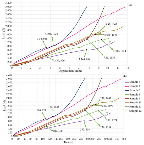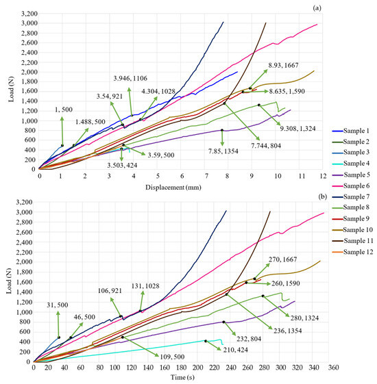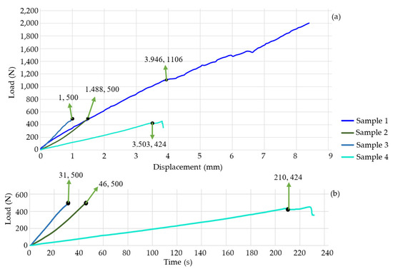 Experimental results. (a) Load displacement graph; (b) load-time graph. The indicated coordinates highlight the bone’s failure points.