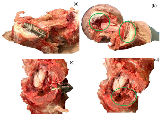 Vertebrae after mechanical testing. (a) Intersomatic screw (sample 3) without displacement in the bone. (b) Footprint left by the screw (sample 3) when it was embedded by stress shielding. (c) Cage (sample 4) without displacement in the bone. (d) Footprint left by the cage (sample 4) when it was embedded by stress shielding. The green circles indicate the marks caused by the Ti prostheses when embedded due to SS.