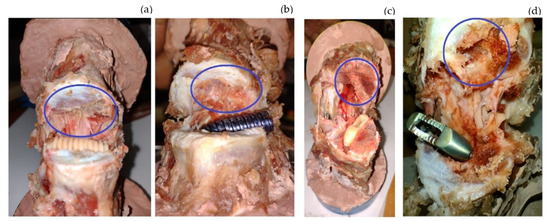 Vertebrae after mechanical testing, with blue circles highlighting the mark left by the SI. (a) Intersomatic screw (sample 9) footprint. (b) Intersomatic screw (sample 7) footprint: the screw was embedded by stress shielding. (c) Cage (sample 8) footprint. (d) Intersomatic screw (sample 6) footprint: the screw was embedded by stress shielding.