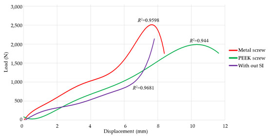 Polynomial regressions were performed using the Ti and PEEK screw test data, as there were four tests conducted for each SI. The polynomial regression of the vertebra without an implant was computed using the data from sample 5 and the previously acquired experimental data from the biomechanics study group. Every case exhibits a regression exceeding 94%, which acts as a criterion for validating the replicability of the results. When comparing the functions associated with the SI, the PEEK (green) function is smoother than the Ti (red) function.