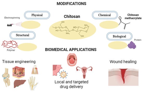 Diagram showing modifications of chitosan and its applications in medicine.