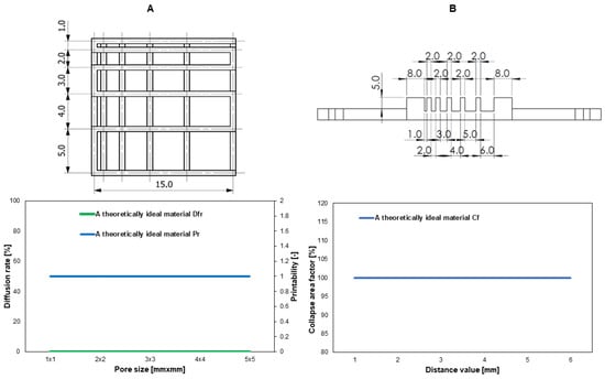 The printability of the materials was evaluated with the following tests: a fusion test of fibers printed in the form of a template, a collapse test of a fiber printed on a 3D platform, and a continuity test of fibers printed from the tested biomaterial in a volume of 3 mL. The method was taken from the available literature [,,]. Figure 3 shows the template and platform model. Additionally, the dependencies of the assessed parameters for a theoretically ideal material are shown.