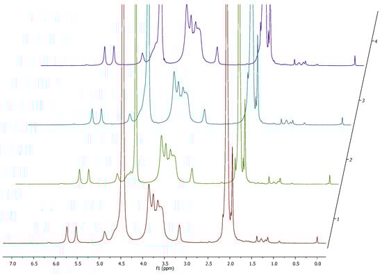 Methacrylated chitosan was obtained in a classical approach [] employing methacrylic anhydride (MAA) as an acylating agent in a reaction carried out in 1% acetic acid. The use of an acidic environment is necessary to obtain satisfactory solubility of chitosan, which, however, has a negative impact on the reactivity of free amino groups due to their protonation. The protonated amino group of -NH2 loses its nucleophilic properties and transforms into -NH3+. Both forms remain in constant equilibrium in the reaction environment, which allows for its functionalization using a large excess of MAA. Through optimization work taking into account the amount of MAA used, temperature, and reaction duration, the target product with a degree of substitution DS ~ 80% was obtained. 1H NMR spectra were measured for each of the obtained products and the results are summarized in Figure 4. On their basis, the degree of product substitution was determined, which was 76% ± 5% for Sample 1, 82% ± 5% for Sample 2, 78% ± 5% for Sample 3, and 79% ± 5% for Sample 4. Additionally, it was demonstrated that there was no contamination with methacrylic acid residues, the signals of which are not visible in the obtained spectra. This result confirms the effectiveness of the method used to purify the reaction mixture. The finished and characterized product, according to the described procedure, was used for further research.