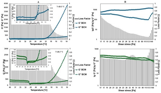 Results of rheology testing, where (A) is the dependence of the complex modulus on temperature and (B) is the complex modulus for BCH (biomaterial with chitosan) and BCM (biomaterial enriched with methacrylated chitosan).