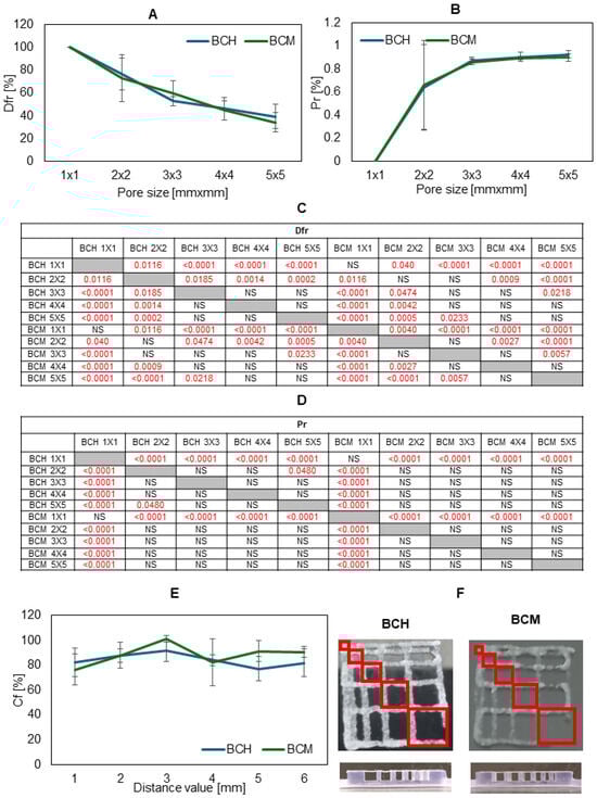 Results of printability testing, where (A) is the diffusion rate, (B) is the printability, and (E) is the collapse area factor for BCH (biomaterial with chitosan) and BCM (biomaterial enriched with methacrylated chitosan). In picture (F), the photos of printed models are shown. Tables (C,D) present the statistical analysis of individual variants of printability experimental results. Statistically significant values are marked in red. In the case of the collapse area factor, the differences were statistically significant for BCM 3 vs. BCH 1 (p = 0.029), BCM 3 vs. BCH 4 (p = 0.0461), BCM 3 vs. BCH 5 (p = 0.0060), BCM 3 vs. BCH 6 (p = 0.0023), BCM 3 vs. BCM 1 (p = 0.0046), and BCM 4 vs. BCM 3 (p = 0.0274). For other data sets, the differences were statistically insignificant.