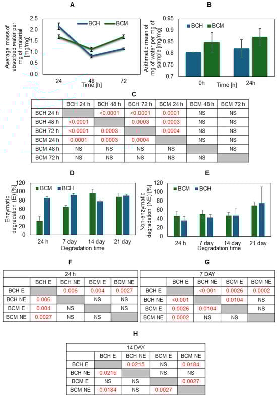 Results of water absorption, swelling test, and the degree of degradation for the tested materials. The average mass of mg of water per mg of sample in the (A) water absorption and (B) swelling test for BCH (biomaterial with chitosan) and BCM (biomaterial enriched with methacrylated chitosan); enzymatic degradation (D) after 24 h, 7 days, 14 days, and 21 days; and non-enzymatic degradation result (E) after the same. The tables (C,F–H) present the statistical analysis of individual variants of the water absorption experimental results and degradation after time. Statistically significant values are marked in red. In the case of the swelling test, the differences were statistically insignificant.