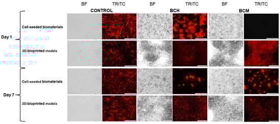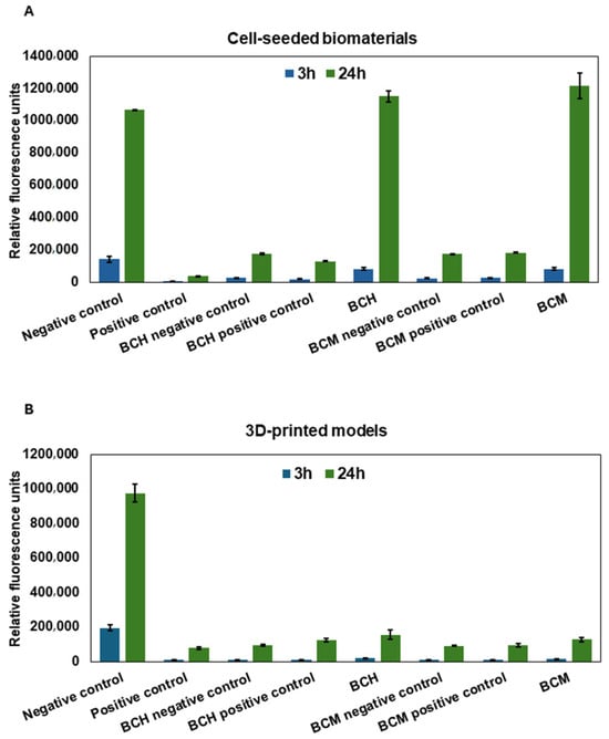 Cell proliferation of RFP-HDFCs-Neo, both in printed models and those directly cultured on the surfaces of biomaterials (BCH and BCM), was assessed using the Alamar Blue assay (Invitrogen™, Waltham, MA, USA). The experimental protocol entailed a 24 h incubation of cells with the Alamar Blue reagent at a 1:10 ratio under standard culture conditions, i.e., 37 °C and 5% CO2. Subsequent to this incubation period, 100 µL of the medium was transferred to black plates to absorb light, minimizing background interference and crosstalk. The absorbance of each sample was then measured at 530 nm and 590 nm using a microplate reader (Agilent BioTek Synergy H1 Plate Reader, Agilent Technologies, Inc. Headquarters, Santa Clara, CA, USA). This methodology yields crucial insights into cell proliferation dynamics in printed models and on biomaterial surfaces at distinct time points, elucidated through changes in absorbance values at specific wavelengths. The negative and the positive control of the reaction was performed. The controls in both were the same as in the assay above.