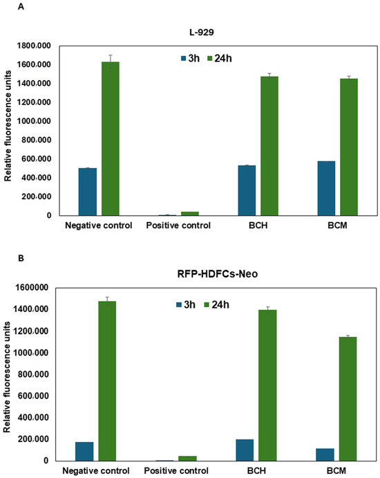 The LDH-Glo™ Cytotoxicity Assay (Promega, Madison, WI, USA) was employed to assess the direct cytotoxicity of the biomaterials (BCH and BCM) in the RFP-HDFCs-Neo cells. This evaluation was conducted in printed models and conventional cell cultures on the surface of the respective biomaterials. The assay was conducted 24 h after printing and seeding. In the experiment, the culture medium was collected and diluted at a ratio of 1:100 in LDH Storage Buffer following the manufacturer’s instructions. Subsequently, all collected samples were stored at −20 °C until the time of the test. The LDH assay was conducted in accordance with the manufacturer’s protocol. After a one-hour incubation period at room temperature, the luminescence signal was measured using a microplate reader (Agilent BioTek Synergy H1 Plate Reader, Agilent Technologies, Inc. Headquarters, Santa Clara, CA, USA). This test offers valuable insights into the cytotoxicity arising from interactions between cells and biomaterials over a specific period. In addition, a control of the reaction was performed. The negative control was cells cultured under standard conditions, i.e., 37 °C and 5% CO2 and biomaterials without cells. The positive control was cells and biomaterials with cells cultured under standard conditions exposed to one hour of incubation with 0,1% Triton X-100.