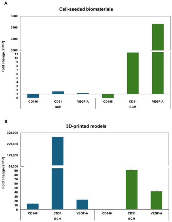 In our study, cell proliferation capacity was also assessed using the Alamar Blue assay (Figure 11). For cell culture on biomaterials for both BCH and BCM, cell proliferation increased over time compared to control cells (Figure 11A). For 3D-printed models, there was no such tendency (Figure 11B). Hussain, A. et al. [] reported that chitosan addition in biomaterial increases the proliferation of cardiovascular cells, in particular fibroblasts and endothelial cells. Howling, G.I. et al. [] demonstrate the relationship associated with increased cell proliferation and the addition of chitosan in cell culture in vitro. The researchers investigated the influence of chitosan derivatives on the proliferation of human skin fibroblasts and keratinocytes [,]. The analysis of their results indicates that chitosan modifications could impact cell mitogenesis. Moreover, the use of chitosan as an addition to increase cell proliferation could be used to rebuild skin after burning, for example. In addition, He, J. et al. [] also presented that the addition of chitosan in hydrogels and its modification can increase stem cell proliferation. On the other hand, Patel, B. et al. [] demonstrate that chitosan-based scaffolds support the mechanical enhancement of stem cell proliferation and differentiation. In addition, it is interesting to add that the hydrophilic structure of chitosan promotes the adhesion and proliferation of many types of cells. In particular, scaffolds allow chitosan to emerge as a suitable candidate for 3D organ bioprinting and could also be used for tissue repair. Celikkin, N. et al. [] show that methacrylation influences cell proliferation. They investigated a study where researchers cultured human bone marrow mesenchymal stem cells encapsulated in GelMA. In this study, we observed not only the proliferation of osteogenic cells but also the induction of endothelial cell differentiation.