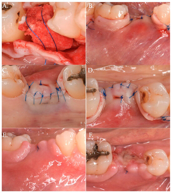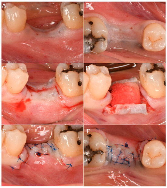 Surgical steps of a patient of Group 2—porcine cross-linked collagen matrix for vertical soft tissue augmentation and a healing abutment combined with a coronally advanced flap (CAF). The pre-surgical pictures demonstrate vertical and horizontal deficiency of the mucosa (Frame A,B). A full thickness flap is raised to get access to the implant platform and position a healing abutment of 3 mm height (Frame C,D). The flap is then released to obtain the necessary advancement (Frame E) and a collagen matrix of 5 mm in thickness is positioned above the healing abutment (Frame F).