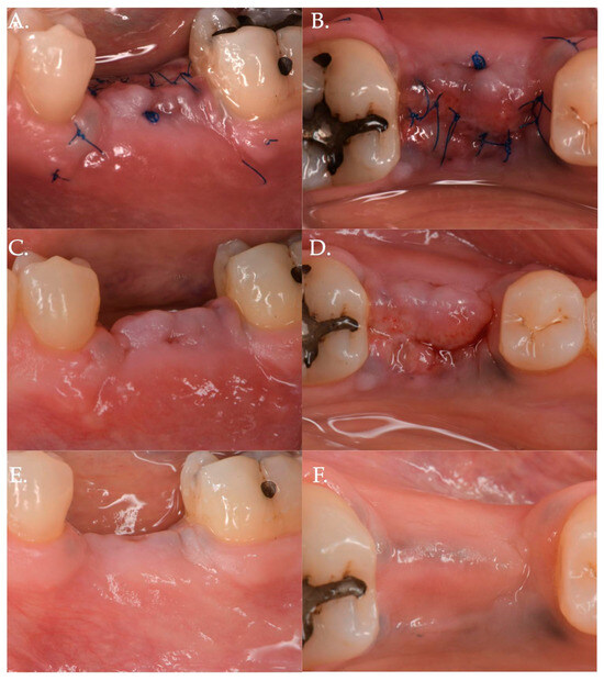 Post-operative healing after Geistlich Fibro-Gide® combined with cover screw and CAF: 1 week (Frame A,B), 2 weeks (Frame C,D), and 3 months post-op (Frame E,F).