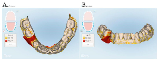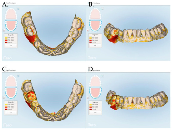 An intraoral scanner (iTero Elements Plus Series®) was used to scan each patient at each time point: 0, 1, 3, and 12 months after mucogingival plastic surgery. The iTero software (Plus Computing Unit 2.8.15.70 ) was able to precisely measure the increase or decrease in the mucosa volume by overlapping the stl files. The software was also able to provide a difference in color to better visualize the 3D mucosa changes (Figure 7 and Figure 8).