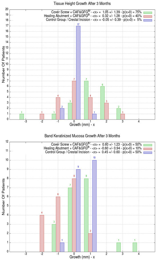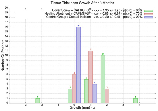 Mucosa thickness, height, and keratinized tissue changes 3 months after mucogingival plastic surgery. Divided by groups, the number of patients is shown as a function of the millimeters of growth or decrease. In the plot keys, the average growth value <x> and the percentage of patients p(x > 0) who have had a strictly positive evolution are reported. It is evident that the group treated with the “Cover Screw Implant combined with CAF and collagen matrix” (green) had a better evolution compared to both the one treated with the “Healing Abutment Implant combined with CAF and collagen matrix” (red) and the control one (blue) for which we performed a crestal incision only.