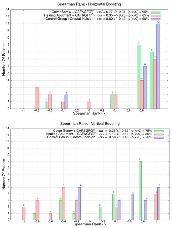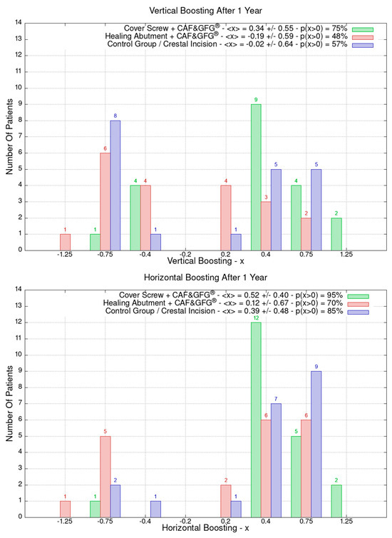 Vertical and horizontal boosting 1 year after surgery. As for Figure 1, divided by groups, the number of patients is reported as a function of boosting. In the plot keys, the average boosting <x> and the percentage of patients p(x > 0) who have had a strictly positive boosting are presented.