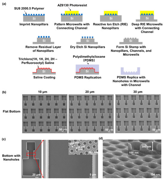 Figure 1a illustrates the fabrication technology used to create a pattern of nanoholes on the bottom of the microwells and connecting channel array on the PDMS (SYLGARDTM 184, Dow, Midland, MI, USA) platforms. Firstly, a silicon (Si) wafer was cleaned in an ultrasonic bath using acetone, isopropanol, and deionized (DI) water, for 10 min each. The wafer was then dried and treated with an O2 plasma to increase its hydrophilicity. Next, SU8 2000.5 photoresist (MicroChem, Westborough, MA, USA) was spin coated onto the wafer, at 3000 revolutions per min, for 1 min, and baked at 65 °C and 95 °C, for 2 min each. The SU8 nanopillars, with a diameter of 280 nm and period of 535 nm, were nanoimprinted using an intermediate polymer stamp (IPS), fabricated by being imprinted from a nickel stamp, with the conditions of 40 bar and 150 °C for 5 min. The IPS was coated with 97% trichloro (1H,1H,2H,2H-perfluorooctyl) silane (FOTS, J&K Scientific, Beijing, China) to facilitate demolding from the SU8 nanopillars. The microwells with connecting channels were then set out in a pattern on top of the SU8 nanopillars, using photolithography with AZ6130 photoresist, followed by reactive ion etching (RIE) to remove the nanopillars not covered by the AZ6130 photoresist. The RIE conditions were 2/20 sccm SF6/O2, 10 mTorr, and 100 W radio frequency (rf) power for 5 min. Deep RIE (DRIE) was then used to etch the Si wafer, to achieve a depth of 50 μm for the microwells and connecting channels. After removing the AZ6130 photoresist, the residual layer around the SU8 nanopillars was removed by RIE, with the conditions of 2/20 sccm SF6/O2, 10 mTorr, and 100 W rf power for 1 min. Another DRIE was conducted to etch the Si nanopillars. After removing the SU8 photoresist, the Si stamp with nanopillars, channels, and microwells was achieved.