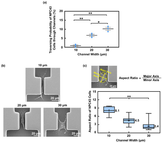 The channel width affected the traversing probability of NPC43 cells through the channels. (a) The traversing probability of NPC43 cells increased with larger channel widths. The surface consisted of flat bottoms. Each blue dot represents result from one round of experiment. (b) Micrographs of NPC43 cells in channels with a width of 10, 20, and 30 μm. (c) NPC43 cell outlined with best-fitted ellipse. Aspect ratio is defined as the ratio between the major and minor axes. The aspect ratio of NPC43 cells decreased with larger channel widths. Note: “+” represents mean value and “−” inside box represents median. One-way ANOVA and Tukey’s post hoc test with ** p < 0.01 and * p < 0.05.