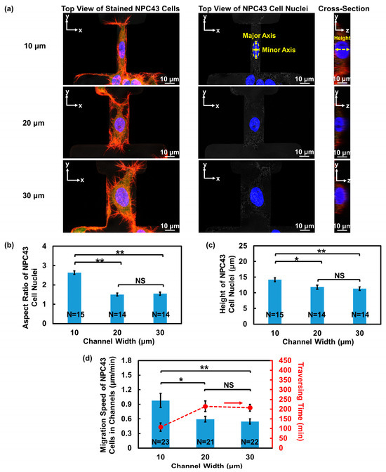 The cell nucleus, being the largest organelle in the cell body, could affect cell behavior during migration through confined regions [33]. To investigate how the NPC43 cell nucleus responds to the confined microenvironment, 3D fluorescence imaging of the fixed cells was conducted, as depicted in Figure 3a. The top view of the NPC43 cell nucleus was analyzed to determine its aspect ratio, while the cross-sectional view was used to assess its height. Figure 3b,c illustrates that there was no significant difference in the cell nucleus aspect ratio and height between the 20 and 30 μm wide channels. However, in the 10 μm wide channels, the NPC43 cell nucleus exhibited a larger aspect ratio and height, suggesting that the NPC43 cell nucleus experienced suppression in the horizontal plane and became more elongated, along the vertical direction. Similar nucleus deformation was also observed during cancer cell invasion in vivo [34,35]. This additional deformation of the nucleus made it more difficult for the NPC43 cells to fit into the 10 μm channels, contributing to the lowest traversing probability.