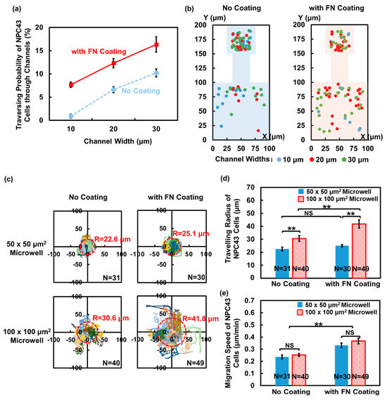 The behavior of cancer cells is influenced not only by the physical confinement of the ECM, but also the ECM proteins, such as FN. FN is a critical component of ECM structures. Through interactions with various cell surface receptors, FN plays a significant role in regulating cell adhesion and migration [40]. In order to investigate the impact of FN on the migration ability and traversing probability of NPC43 cells, FN was coated on the microwells and connecting channels. The introduction of the FN coating onto the platforms led to a significant increase in the traversing probability of the NPC43 cells compared to the ones without a coating. As illustrated in Figure 4a, the probability of the NPC43 cells traversing through channels of 10, 20, and 30 μm widths, with an FN coating, increased to 7.7%, 12.3%, and 16.3%, respectively, compared to 0.9%, 6.6%, and 10.2%, respectively, for platforms without an FN coating.