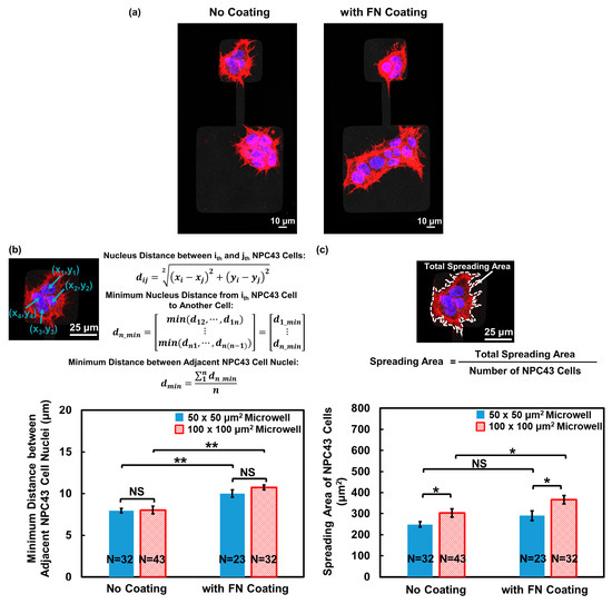 Effect of FN coating on NPC43 cell dispersion and spreading in microwells with flat bottoms. (a) Fluorescence images of NPC43 cell clusters on platforms without FN coating and comparison to platforms with FN coating. NPC43 cells were stained to observe F-actin (red) and nucleus (blue). (b) Minimum distance between adjacent NPC43 cell nuclei increased on platforms with FN coating. (c) Joint effect of FN coating and microwell size on spreading area of NPC43 cells. One-way ANOVA and Tukey’s post hoc test with ** p < 0.01, * p < 0.05, and NS—not significant with p > 0.05.