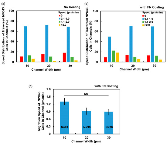 After observing the enhanced migration ability of NPC43 cells in the microwells with an FN coating, the subsequent investigation focused on determining the potential impact of an FN coating on NPC43 cell migration through channels. The migration speed of the NPC43 cells through the channels, obtained every 5 min over 16 h, were calculated for the platforms without and with an FN coating, and the cell migration speed distributions are plotted in Figure 6a,b. The migration speed of the NPC43 cells through the channels, measured every 5 min, were categorized into four groups. Comparing Figure 6a,b, it is evident that the presence of an FN coating resulted in a higher percentage of migration speeds falling within the range > 2 μm/min across all channel widths, indicating an increase in the motility of NPC43 cells through the channels with an FN coating. The average migration speed of NPC43 cells through channels with an FN coating was further analyzed, as shown in Figure 6c. The results demonstrated that the average migration speed of the NPC43 cells increased to 1.30, 0.92, and 0.90 μm/min, respectively, with an FN coating and channels with 10, 20, and 30 μm widths, as compared to the channels without an FN coating, which exhibited speeds of 0.97, 0.59, and 0.55 μm/min, respectively. However, in regard to the 10 μm wide channels, no significant differences were observed. The NPC43 cell migration speed increased by 34% following an FN coating of the 10 μm wide channels. For the wider channels of 20 and 30 μm, the overall cell migration speeds were lower, but the percentage of the speed increase due to the FN coating was higher. These results suggest that the FN coating exerted a dominant effect on cell motility in a loosely confined microenvironment, while in a highly restricted area, the influence of physical confinement could partially override the impact of the FN coating.