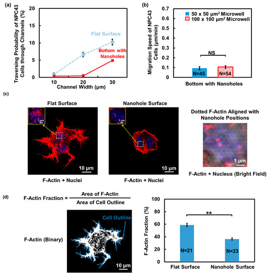 Effect of nanohole topography on the bottom of microwells with connecting channels on the traversing behavior and F-actin distribution of NPC43 cells. (a) Traversing probability of NPC43 cells in platforms with flat surface and with a pattern of nanoholes on the bottom. (b) NPC43 cells had lower migration speed in microwells with nanoholes compared to platforms with a flat bottom. Microwell size did not affect the migration speed. (c) F-actin in NPC43 cells on flat surface was denser, while F-actin on surface with nanoholes was sparse and formed some dotted structures. NPC43 cells were stained to observe the F-actin (red) and nucleus (blue). (d) F-actin fraction in NPC43 cells on surface with nanoholes was smaller. Fluorescence images of F-actin were converted to binary images, where the white areas represent the presence of F-actin structures. F-actin fraction is defined as the ratio between F-actin and the cell outline area. One-way ANOVA and Tukey’s post hoc test with ** p < 0.01 and NS—not significant with p > 0.05.