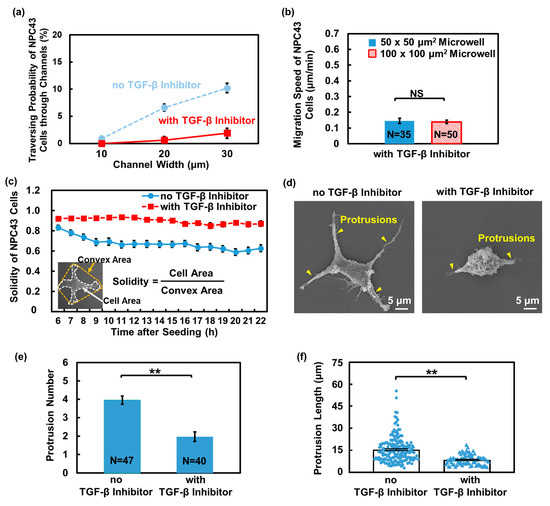 Effect of TGF-β inhibition on traversing behavior of NPC43 cells in microwells with a flat bottom. (a) Traversing probability of NPC43 cells without and with TGF-β inhibitor treatment in platforms with a flat bottom. (b) Migration speed of NPC43 cells decreased with the addition of TGF-β inhibitor. Microwell size did not affect the migration speed. (c) During 16 h time-lapse imaging, the solidity of NPC43 cells remained unchanged in response to TGF-β inhibitor, while without the TGF-β inhibitor, the solidity of the NPC43 cell decreased. Solidity is defined as the cell area divided by the convex area. (d) Micrographs of NPC43 cell without and with TGF-β inhibition. (e) Number of protrusions of NPC43 cells decreased with the TGF-β inhibitor addition. (f) Protrusion length of NPC43 cells decreased with the TGF-β inhibitor addition. Each blue dot or triangle represents length of one protrusion. One-way ANOVA and Tukey’s post hoc test with ** p < 0.01 and NS—not significant with p > 0.05.